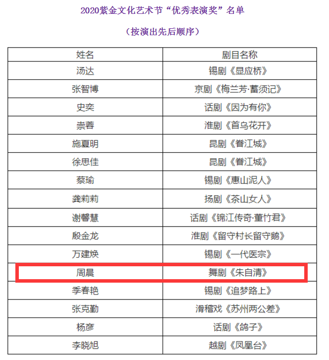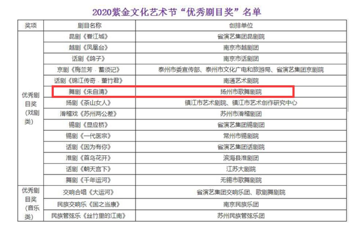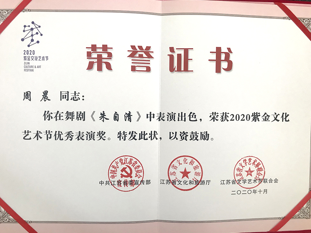 10月30日晚,江蘇大劇院綜藝廳燈光璀璨,“花開盛世——2020紫金文化藝術節頒獎儀式”隆重舉行。由揚州市文化廣電和旅游局、揚州市歌舞劇院有限公司出品的舞劇《朱自清》榮獲“優秀劇目獎”,朱自清飾演者周晨榮獲“優秀表演獎”。